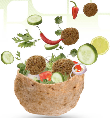 ground chickpeas fresh vegetables&imported herbs in pita sandwiche with salad &hums and tahini sauce &tomato.