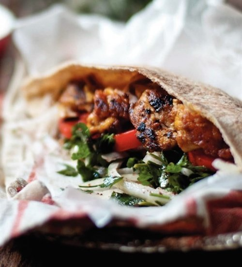 Chicken Shawarma Sandwich with salad and garlic sauce Served On Pitas